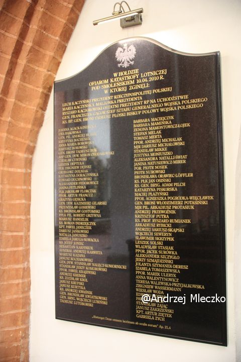 Napis: W HOŁDZIE/ OFIAROM KATASTROFY LOTNICZEJ/ POD SMOLEŃSKIEM 10.04.2010 R./ W KTÓREJ ZGINĘLI/ LECH KACZYŃSKI, PREZYDENT RZECZPOSPOLITEJ POLSKIEJ/ MARIA KACZYŃSKA MAŁŻONKA PREZYDENTA/ RYSZARD KACZOROWSKI, OSTATNI PREZYDENT RP NA UCHODŹSTWIE/ GEN. FRANCISZEK GĄGOR SZEF SZTABU GENERALNEGO WOJSKA POLSKIEGO/ KS. BP. GEN. BRONI TADEUSZ PŁOSKI BISKUP POLOWY WOJSKA POLSKIEGO/ JOANNA AGACKA-INDECKA/ EWA BĄKOWSKA/ GEN. PIL. ANDRZEJ BŁASIK/ KRYSTYNA BOCHENEK/ ANNA MARIA BOROWSKA/ BARTOSZ BOROWSKI/ GEN. BRONI TADEUSZ BUK/ ABP. GEN. DYW. MIRON CHODAKOWSKI/ CZESŁAW CYWIŃSKI/ LESZEK DEPTUŁA/ ZBIGNIEW DĘBSKI/ GRZEGORZ DOLNIAK/ KATARZYNA DORACZYŃSKA/ EDWARD DUCHNOWSKI/ ALEKSANDER FEDOROWICZ/ JANINA FETLIŃSKA/ JAROSŁAW FLORCZAK/ ARTUR FRANCUZ/ GRAŻYNA GĘSICKA/ GEN. DYW. KAZIMIERZ GILARSKI/ PRZEMYSŁAW GOSIEWSKI/ KS. BRONISŁAW GOSTOMSKI/ PPŁK. PIL. ROBERT GRZYWNA/ MARIUSZ HANDZLIK/ KS. ROMAN INDRZEJCZYK/ KPT. PAWEŁ JANECZEK/ DARIUSZ JANKOWSKI/ NATALIA JANUSZKO/ IZABELA JARUGA NOWACKA/ KS. JÓZEF JONIEC/ SEBASTIAN KARPINIUK/ ANDRZEJ KARWETA/ MARIUSZ KAZANA/ JANUSZ KOCHANOWSKI/ GEN. DYW. STANISŁAW NAŁĘCZ KOMORNICKI/ STANISŁAW JERZY KOMOROWSKI/ PPOR. PAWEŁ KRAJEWSKI/ ANDRZEJ KREMER/ KS. ZDZISŁAW KRÓL/ JANUSZ KRUPSKI/ JANUSZ KURTYKA/ KS. ANDRZEJ KWAŚNIK/ GEN. BRONISŁAW KWIATKOWSKI/ GEN. BRYG. WOJCIECH LUBIŃSKI/ TADEUSZ LUTOBORSKI/ BARBARA MACIEJCZYK/ BARBARA MAMIŃSKA/ ZENONA MAMONTOWICZ-ŁOJEK/ STEFAN MELAK/ TOMASZ MERTA/ PPOR. ANDRZEJ MICHALAK/ MJR DARIUSZ MICHAŁOWSKI/ STANISŁAW MIKKE/ JUSTYNA MONIUSZKO/ ALEKSANDRA NATALLI-ŚWIAT/ JANINA NATUSIEWICZ-MIRER/ POR. PIOTR NOSEK/ PIOTR NUROWSKI/ BRONISŁAWA ORAWIEC LOEFFLER/ KS. PŁK JAN OSIŃSKI/ KS. GEN. BRYG. ADAM PILCH/ KATARZYNA PISKORSKA/ MACIEJ PŁAŻYŃSKI/ PPOR. AGNIESZKA POGRÓDKA-WIĘCŁAWEK/ GEN. BRONI WŁODZIMIERZ POTASIŃSKI/ MJR PIL. ARKADIUSZ PROTASIUK/ ANDRZEJ PRZEWOŹNIK/ KRZYSZTOF PUTRA/ KS. PROF. RYSZARD RUMIANEK/ ARKADIUSZ RYBICKI/ ANDRZEJ SARIUSZ-SKĄPSKI/ WOJCIECH SEWERYN/ SŁAWOMIR SKRZYPEK/ LESZEK SOLSKI/ WŁADYSŁAW STASIAK/ PPOR.JACEK SURÓWKA/ ALEKSANDER SZCZYGŁO/ JERZY SZMAJDZIŃSKI/ JOLANTA SZYMANEK-DERESZ/ IZABELA TOMASZEWSKA/ PPOR. MAREK ULERYK/ ANNA WALENTYNOWICZ/ TERESA WALEWSKA-PRZYJAŁKOWSKA/ ZBIGNIEW WASSERMANN/ WIESŁAW WODA/ EDWARD WOJTAS/ PAWEŁ WYPYCH/ STANISŁAW ZAJĄC/ JANUSZ ZAKRZEŃSKI/ KPT. ARTUR ZIĘTEK/ GABRIELA ZYCH/ "Absterget Deus omnem lacrimam ab oculis eorum" Ap.21,4