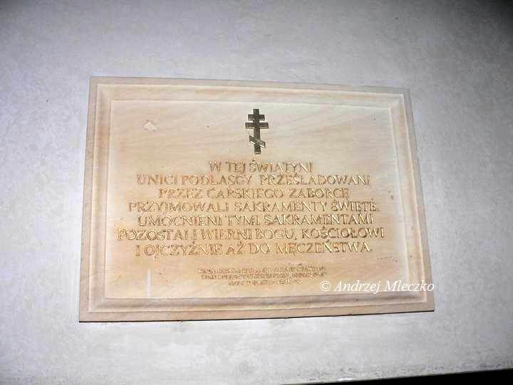 Napis: W TEJ ŚWIĄTYNI/ UNICI PODLASCY PRZEŚLADOWANI/ PRZEZ CARSKIEGO ZABORCĘ/ PRZYJMOWALI SAKRAMENTY ŚWIĘTE./ UMOCNIENI TYMI SAKRAMENTAMI/ POZOSTALI WIERNI BOGU, KOŚCIOŁOWI/ I OJCZYŹNIE AŻ DO MĘCZEŃSTWA/ NA PAMIĄTKĘ BEATYFIKACJI W RZYMIE W ROKU 1995/ RUCH KULTURY CHRZEŚCIJAŃSKIEJ "ODRODZENIE"/ BIAŁA PODLASKA-KRAKÓW