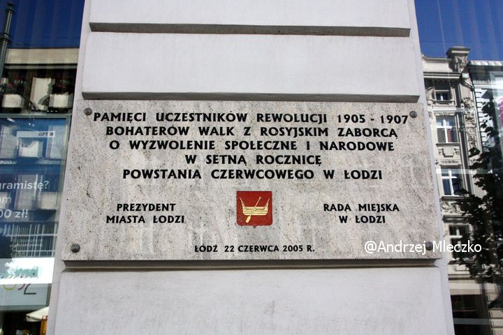 Napis: PAMIĘCI UCZESTNIKÓW REWOLUCJI 1905 - 1907/ BOHATERÓW WALK Z ROSYJSKIM ZABORCĄ/ O WYZWOLENIE SPOŁECZNE I NARODOWE/ W SETNĄ ROCZNICĘ/ POWSTANIA CZERWCOWEGO W ŁODZI/ PREZYDENT/ MIASTA ŁODZI/ RADA MIEJSKA/ W ŁODZI/ ŁÓDŹ 22 CZERWCA 2005 R.
