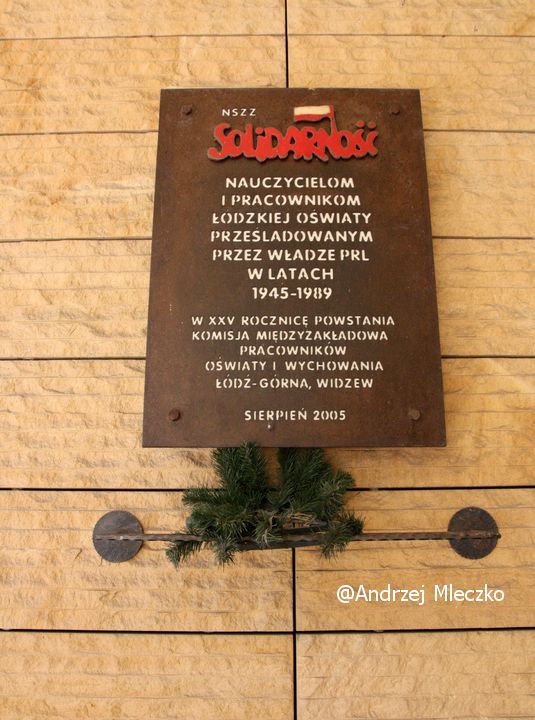 Napis: NSZZ SOLIDARNOŚĆ/ NAUCZYCIELOM I PRACOWNIKOM/ ŁÓDZKIEJ OŚWIATY/ PRZEŚLADOWANYM/ PRZEZ WŁADZE PRL/ W LATACH 1945-1989/ W XXV ROCZNICĘ POWSTANIA/ KOMISJA MIĘDZYZAKŁADOWA/ PRACOWNIKÓW/ OŚWIATY I WYCHOWANIA/ ŁÓDŹ-GÓRNA, WIDZEW, SIERPIEŃ 2005