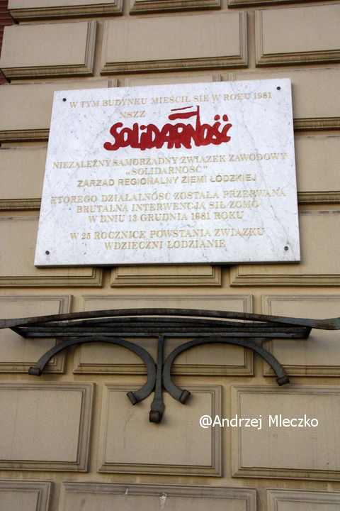 Napis: W TYM BUDYNKU MIEŚCIŁ SIĘ W ROKU 1981/ NSZZ/ SOLIDARNOŚĆ/ NIEZALEŻNY SAMORZĄDNY ZWIĄZEK ZAWODOWY/ "SOLIDARNOŚĆ"/ ZARZĄD REGIONALNY ZIEMI ŁÓDZKIEJ/ KTÓREGO DZIAŁALNOŚĆ ZOSTAŁA PRZERWANA/ BRUTALNĄ INTERWENCJĄ SIŁ ZOMO/ W DNIU 13 GRUDNIA 1981 ROKU/ W 25 ROCZNICĘ POWSTANIA ZWIĄZKU/ WDZIĘCZNI ŁODZIANIE