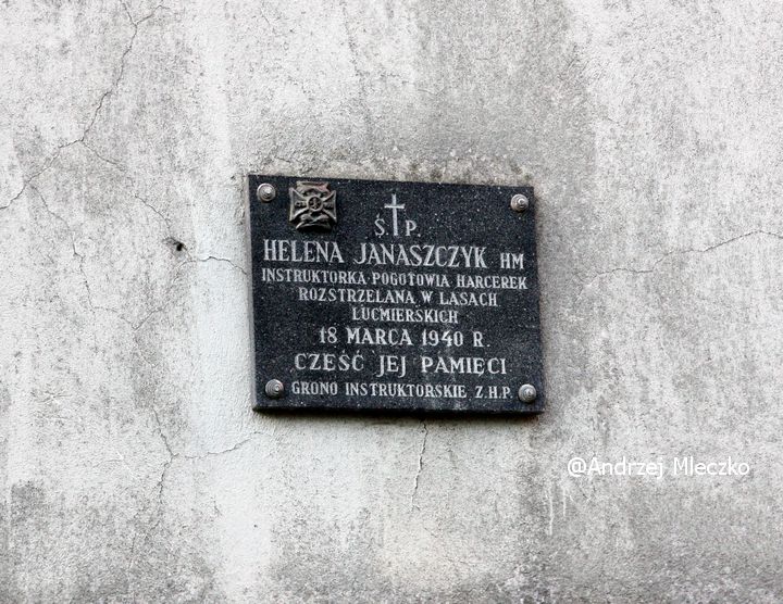 Napis: Ś.P./ HELENA JANASZCZYK HM/ INSTRUKTORKA POGOTOWIA HARCEREK/ ROZSTRZELANA W LASACH/ ŁUCMIERSKICH/ 18 MARCA 1940 R./ CZEŚĆ JEJ PAMIĘCI/ GRONO INSTRUKTORSKIE Z.H.P.