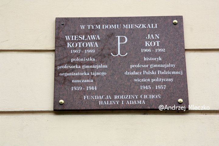 Napis: W TYM DOMU MIESZKALI/ WIESŁAWA KOTOWA/ 1907-1989/ polonistka/ profesorka gimnazjalna/ organizatorka tajnego/ nauczania/ 1949-1944/ JAN KOT/ 1906-1992/ historyk, profesor gimnazjalny/ działacz Polski Podziemnej/ więzień polityczny/ 1945-1957/ FUNDACJA RODZINY CICHOŃ/ HALINY I ADAMA