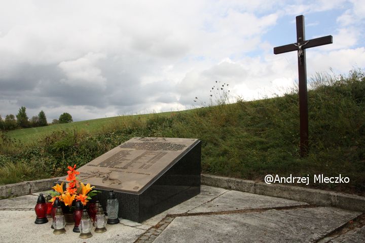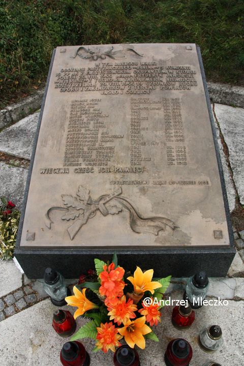 Napis: W TYM MIEJSCU WALKI/ ODDZIAŁU PARTYZANCKIEGO „JANINA” 5 KOMPANII/ 16 PP AK Z FASZYSTOWSKIM OKUPANTEM W KTÓREJ/ POLEGŁ 26. VIII. 1944 pchor. FRYDERYK JAWORSKI/ „WIERUSZ” Z TUCHOWA. ŻANDARMERIA NIEMIECKA/ ROZSTRZELAŁA 29.VIII. 1944 19 CZŁONKÓW RUCHU/ OPORU I ZAKŁADNIKÓW Z TERENU POWIATÓW/ JASŁO I GORLICE/ ADAMIK JÓZEF GÓRZYCE UR. 1907/ BRACH ADAM ŻMIGRÓD NOWY UR. 1921/ CICHOŃ JAN TOKI UR. 1924/ DZIADOSZ JAN ŻMIGRÓD NOWY 1895/ GAĆ BRONISŁAW TOKI UR. 1911/ HUĆKO WŁADYSŁAW TOKI UR. 1910/ KOSZYK PIOTR GORLICE UR. 1914/ KUŹNIECKI LEON TOKI 1901/ KURCZABA KAROL TOKI/ UR. 1911/ MELKO ROMAN GORLICE UR. 1929/ PRZYBYŁOWSKI JAN TOKI UR. 1896/ PRZYBYŁOWSKI BRONISŁAW TOKI UR. 1906/ PRZYBYŁOWSKI KAROL TOKI UR. 1908/ PSZCZELIŃSKI N. WYSIEDLONY/ SKOŁUDA FRANCISZEK TOKI UR. 1896/ ŚMIERTELNY TOMASZ TOKI UR. 1894/ ŚMIERTELNY STEFAN TOKI UR. 1925/ TELMA FRANCISZEK GORZYCE UR. 1901/ ŹREBIEC WOJCIECH TOKI UR. 1913/ WIECZNA CZEŚĆ ICH PAMIĘCI/ SPOŁECZEŃSTWO ZIEMI GORLICKIEJ 1968