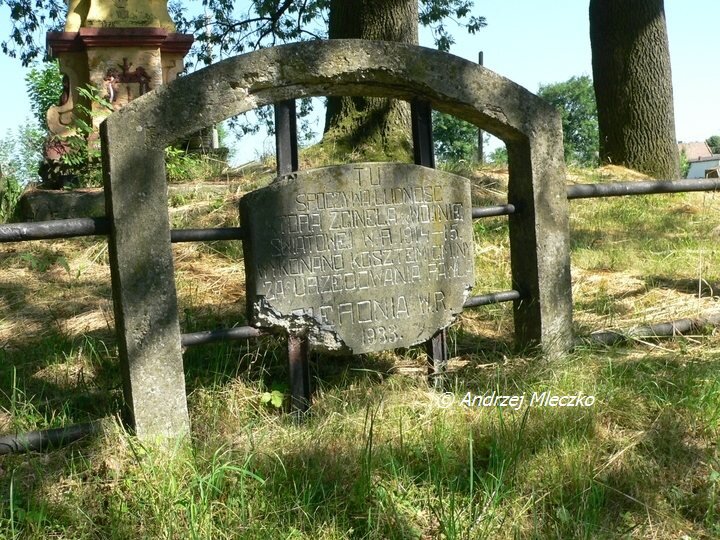 Napis: TU/ SPOCZYWA LUDNOŚĆ/ KTÓRA ZGINĘŁA W WOJNIE/ ŚWIATOWEJ W.R. 1914-1915./ WYKONANO KOSZTEM GMINY/ ZA URZĘDOWANIA PAWŁA/ GIERONIA W.R./ 1933