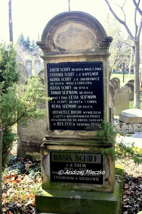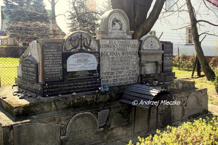 Cmentarz żydowski w Bochni został utworzony w 1872 r. Do dzisiejszego dnia zachowało się tu około 800 nagrobków. Pomnik rozstrzelanych przez Niemców Żydów został wzniesiony ze szczątków macew. W czasie okupacji hitlerowcy zamordowali w tym miejscu około 300 Żydów i pojedynczych Polaków o nieustalonych nazwiskach. Na terenie cmentarza znajdują się macewy wspominające żydowskie ofiary okupacyjnego terroru. Jest to m.in. rodzina Rothkopf z podanym miejscem kaźni: Kiwa w Bochni; Ella w Bochni; Lejzor w Bełżcu; rodzina Silberberg - Frania w Stutthof, Wolf w Mauthausen; Berta w bozie Szebnie; Zygmunt Austerweil zginął 15 IX 1942; Maria Peritz Rózia Faber; Jakub Schiff (1889) , jego żona Sydonia Schiff z domu Kapelner, Mania Schiff z domu Jakubowicz (ur. 1914) i córka Basia Schiff (ur. 1941), Roman Seifmann (1896) z zoną Cesią Seifman z domu Schiff (1897) córką Renią Seifmann (1927) wywiezieni Bełżca 1942, Basia Schiff 1891 - 1939 pochowana na cmentarzu żydowskim w Krakowie; Tadeusz Stillman, Izzak Gruner lat 37, zona Rachela lat 34 i córka Rita lat 4, zginęli w 1943; Sala z Fischlerów Schwellowa lat 42, Hania z Fischlerów Stromowa lat 40 z mężem Berkiem i dziećmi; Róża Hirsch z Wiśnicza zginęła 12 V 1943, mąż Szymon, córka Chancie i jej mąż Mailoch i dzieci w 1943; Majer Jakubowicz, Frania Rumplerowa z corką Reniusią, Surcia Schweberowa z córeczką Felusią; Resia Jakubowicz, Józef Jakubowicz, który poległ w walce na froncie we IX 1939; Izydor Schneider 1878-12 03 1941; zginęli w 1943 Regina Schneider lat 61, Rena Schneider l 39 i Roman Ehrenfreund l 35; Mojżesz Kornhauser 1886-1941 w Bucharze; Estera Kornhauser 1886-2 IX 1943 w Bochni i Jakub Kornhauser 1922- 27 VIII 1942 Bełżec.