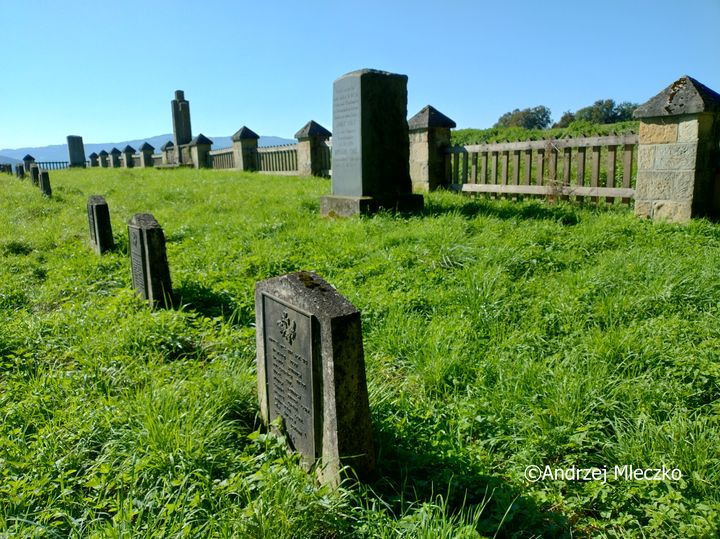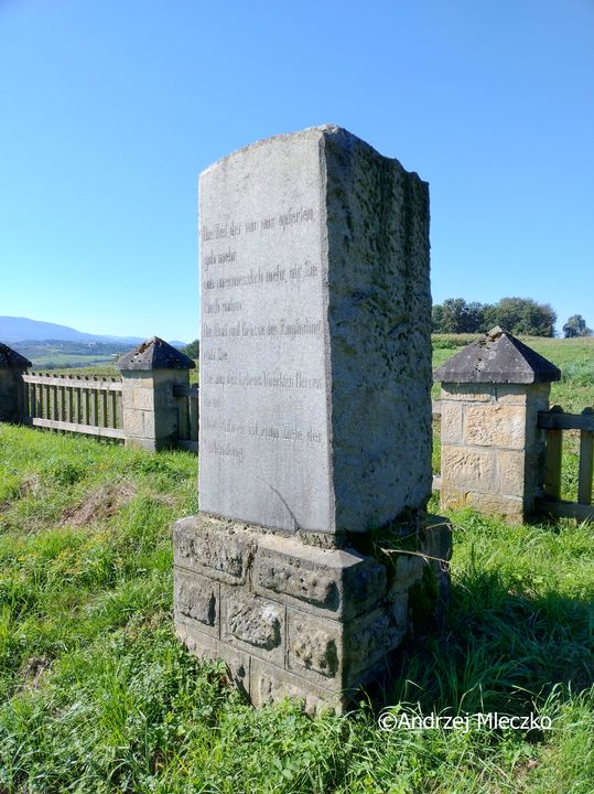 Napis: Treu bis ind den Tod!/ Im Res.Inf. Regt. 217 M.G. Zug fielen hier am 6.12.1914 im Kämpfe für ihr Vaterland und für Befreiung/ Galizens die beiden Brüder/ ADOLF CUNY/ cand. med. (Tübingen)/ Kriegsfreiwilliger/ geb. 21.1.1894/ RICHARD CUNY/ Leutnant im. Inf.Regt. 27 (Halberstadt)/ Führer des M.G. Zuges/ geb. 30.3.1895