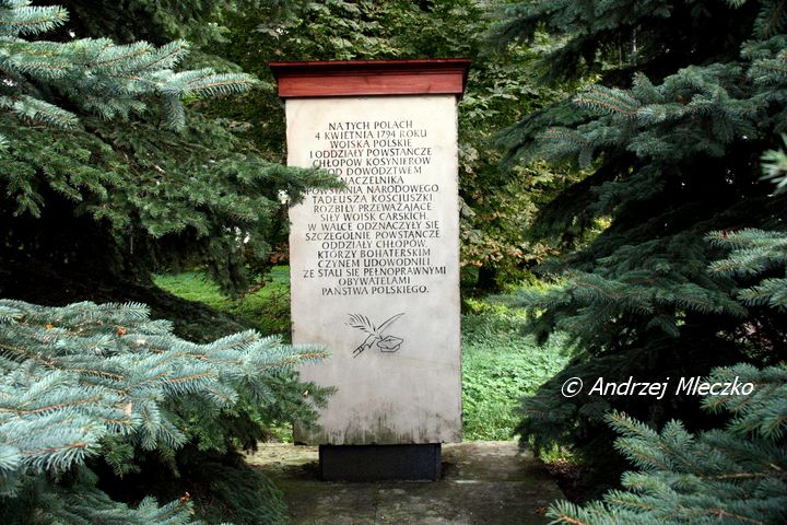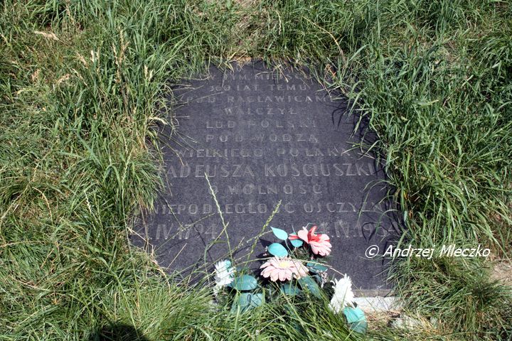 Napis: NA TYCH POLACH/ 4 KWIETNIA 1794 ROKU/ WOJSKA POLSKIE/ I ODDZIAŁY POWSTAŃCZE/ CHŁOPÓW KOSYNIERÓW/ POD DOWÓDZTWEM/ NACZELNIKA/ POWSTANIA NARODOWEGO/ TADEUSZA KOŚCIUSZKI/ ROZBIŁY PRZEWAŻAJĄCE/ SIŁY WOJSK CARSKICH./ W WALCE ODZNACZYŁY SIĘ/ SZCZEGÓLNIE POWSTAŃCZE/ ODDZIAŁY CHŁOPÓW/ KTÓRE BOHATERSKIM/ CZYNEM UDOWODNILI/ ŻE STALI SIĘ PEŁNOPRAWNYMI/ OBYWATELAMI/ PAŃSTWA POLSKIEGO