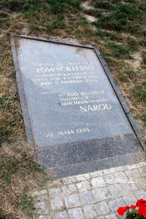 Napis: WOJCIECHOWI BARTOSZOWI/ GŁOWACKIEMU/ CHŁOPSKIEMU BOHATEROWI/ BITWY POD RACŁAWICAMI/ W DNIU 4 KWIETNIA 1794 R./ W 200 ROCZNICĘ/ INSUREKCJI/ KOŚCIUSZKOWSKIEJ/ NARÓD / 22 MAJA 1994