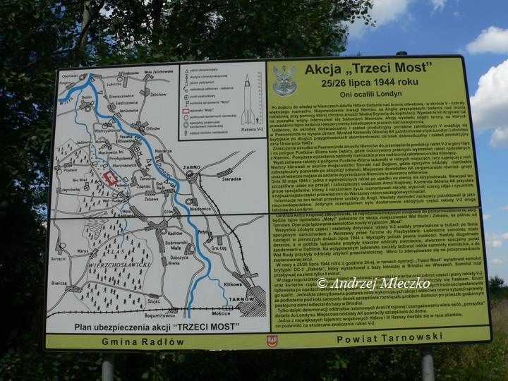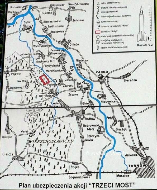 Ustalono, że ośrodek doświadczalny i zakład produkcyjny pocisków rakietowych V znajdują się w Peenemunde na wyspie Uznam. Wywiad Komendy Głównej AK poinformował o tym Londyn. Lotnictwo brytyjskie, po długich przygotowaniach zbombardowało ośrodek doświadczalny i zakład produkcyjny dnia 18 VIII 1943 r. Zniszczenie ośrodka w Peenemunde zmusiło Niemców do przeniesienia produkcji rakiet V-2 w góry Harz i na poligon Pustków-Blizna koło Dębicy, gdzie dokonywano próbnych wystrzeleń rakiet nadesłanych z Niemiec. Powyższe wydarzenia opóźniły niemieckie prace nad bronią rakietową o kilka miesięcy. Wystrzeliwane rakiety z poligonu Pustków-Blizna lądowały w różnych miejscach, lecz najwięcej z nich Niemcy kierowali w okolice miejscowości Sarnaki nad Bugiem, gdzie specjalne oddziały niemieckie zabezpieczały pozostałe po eksplozji odłamki. Miejscowe dowództwo AK zorganizowało również grupy poszukiwawcze mające za zadanie wyprzedzenie Niemców w zbieraniu odłamków. Dnia 30 maja 1944 r. jedna z wystrzelonych rakiet po upadku na ziemię nie eksplodowała. Niewypał ten szczęśliwie udało się przejąć i zabezpieczyć oddziałom Armii Krajowej. Komenda Główna AK przysłała grupę specjalistów, którzy z narażeniem życia rozmontowali rakietę, wykonali szereg zdjęć i rysunków, a najważniejsze części przewieziono do Warszawy celem szczegółowych badań. Informacje na ten temat przesłane zostały do Anglii. Niestety zachodni naukowcy potraktowali je jako nieprawdopodobne. Jedynym rozwiązaniem było dostarczenie zdobytych części rakiety V-2 drogą lotniczą do Londynu. Centrala Armii Krajowej zdecydowała, że najodpowiedniejszym miejscem do przeprowadzenia tej akcji będzie tajne lądowisko "Motyl" położone na skraju miejscowości Wał Ruda i Zabawa, na północ od Tarnowa. operacje lądowania samolotów nosiły kryptonim "Most". Wszystkie zdobyte części i materiały dotyczące rakiety V-2 zostały przewiezione w butlach po tlenie specjalnym samochodem z Warszawy przez Tarnów do Przybysławic. Lądowanie samolotu miało nastąpić w pierwszych dniach lipca 1944 r. Wystąpiły jednak pewne trudności. Nastały długotrwałe deszcze, a w pobliże lądowiska przybyły znaczne oddziały niemieckie, utworzono specjalny punkt żandarmerii w Dęblinie. Na wytypowanym lądowisku zaczęły lądować lekkie samoloty niemieckie, a do Wał Rudy przybyły oddziały artylerii przeciwlotniczej. Mimo to zdecydowano się na przeprowadzenie zaplanowanej akcji. W nocy z 25/26 lipca 1944 roku o godzinie 24-ej, w ramach operacji "Trzeci Most" wylądował samolot brytyjski DC-3 "Dakota", który wystartował z bazy lotniczej w Brindisi we Włoszech. Samolot miał przebywać na ziemi tylko 5 minut. W ciągu tego krótkiego czasu miano wyładować przesyłki i kurierów oraz zabrać części i plany rakiet V-2 oraz kurierów rządu emigracyjnego. Niestety parokrotne próby startu kończyły się fiaskiem. Grunt lądowiska po opadach był grząski. Załoga samolotu w obliczu zaistniałych trudności postanowiła go spalić. Jednakże zdecydowana postawa osób wykonujących akcję i właściwa ocena sytuacji sprawiły, że podłożenie pod koła samolotu desek szczęśliwie rozwiązało problem. Samolot po przeszło godzinnym postoju na ziemi odleciał do bazy w Brindisi. Tylko dzięki determinacji i zaangażowaniu wielu osób "przesyłka" dotarła do Londynu. Miejscowe oddziały AK powróciły szczęśliwie do domu. Jedna z największych tajemnic wojskowych Hitlera i III Rzeszy dostała się w ręce aliantów, co pozwoliło na skuteczne zwalczanie rakiet V-2.