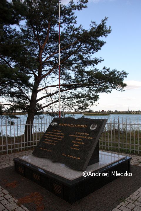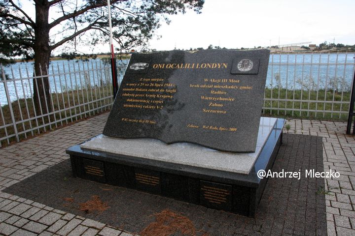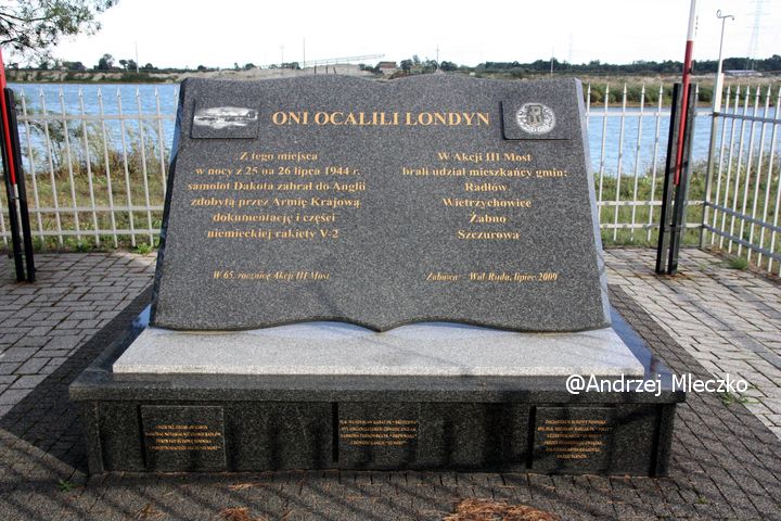 Napis: ONI OCALILI LONDYN/ Z tego miejsca/ w nocy z 25 na 26 lipca 1944 r./ samolot Dakota zabrał do Anglii/ zdobytą przez Armię Krajową/ dokumentację i części/ niemieckiej rakiety v-2/ W 65. rocznicę Akcji III Most
