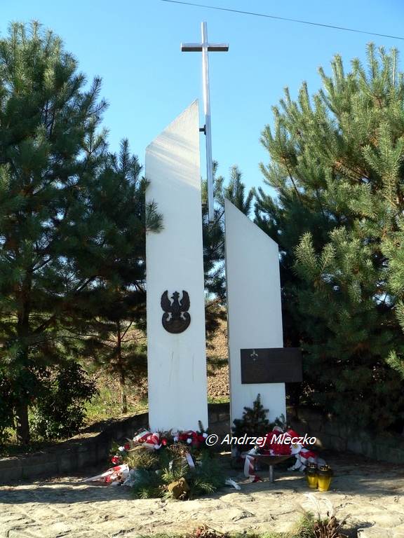 Napis: W TYM MIEJSCU/ 15 IX 1944 R./ PARTYZANCI 16 p.p./ ARMII KRAJOWEJ/ ZIEMI TARNOWSKIEJ-/ I BATALIONU "BARBARA"/ IV KOMPANII "EWA"/ STOCZYLI WALKĘ/ Z ZAŁOGĄ WOJSKOWEGO/ TRANSPORTU NIEMIECKIEJ/ JEDNOSTKI PANCERNEJ