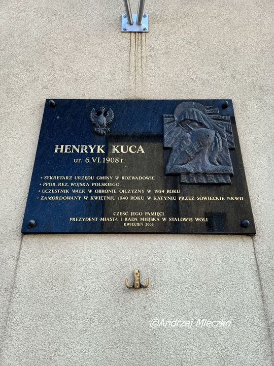 Napis: HENRYK KUCA/ ur. 6. VI. 1908 r./ + SEKRETARZ URZĘDU GMINY W ROZWADOWIE/ + PPOR. REZ. WOJSKA POLSKIEGO/ + UCZESTNIK WALK W OBRONIE OJCZYZNY W 1939 ROKU/ + ZAMORDOWANY W KWIETNIU 1940 ROKU W KATYNIU PRZEZ SOWIECKIE NKWD/ CZEŚĆ JEGO PAMIĘCI/ PREZYDENT MIASTA I RADA MIEJSKA W STALOWEJ WOLI/ KWIECIEŃ 2006