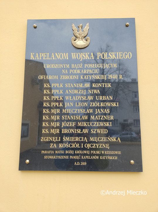 Napis: KAPELANOM WOJSKA POLSKIEGO/ URODZONYM BĄDŹ POSŁUGUJĄCYM/ NA PODKARPACIU/ OFIAROM ZBRODNI KATYŃSKIEJ/ KS. PPŁK STANISŁAW KONTEK/ KS. PPŁK ANDRZEJ NIWA/ KS. PPŁK WŁADYSŁAW URBAN/ KS. PPŁK JAN LEON ZIÓŁKOWSKI/ KS. MJR MIECZYSŁAW JANAS/ KS. MJR STANISŁAW MATZNER/ KS. MJR JÓZEF MIKUCZEWSKI/ KS. MJR BRONISŁAW SZWED/ ZGINĘLI ŚMIERCIĄ MĘCZEŃSKĄ/ ZA KOŚCIÓŁ I OJCZYZNĘ/ PARAFIA MATKI BOŻEJ KRÓLOWEJ POLSKI W RZESZOWIE/ STOWARZYSZENIE PAMIĘĆ KAPELANÓW KATYŃSKICH/ A.D.2019