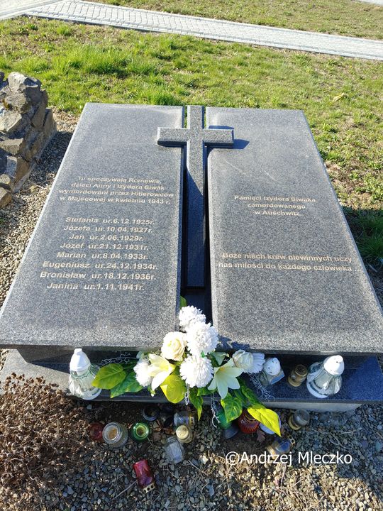 Napis: Tu spoczywają Romowie,/ dzieci Anny Izydora Siwak/ wymordowani przez Hitlerowców/ w Majscowej w kwietniu 1943 r./ Stefania ur. 6.12.1925r./ Józefa ur. 10.04.1927r./ Jan ur. 2.06.1929r./ Józef ur. 21.12.1931 r./ Marian ur. 8.04.1933/ Eugeniusz ur.24,12.1934r./ Bronisław ur. 18.12.1936r./ Janina ur.1.11.1941r.