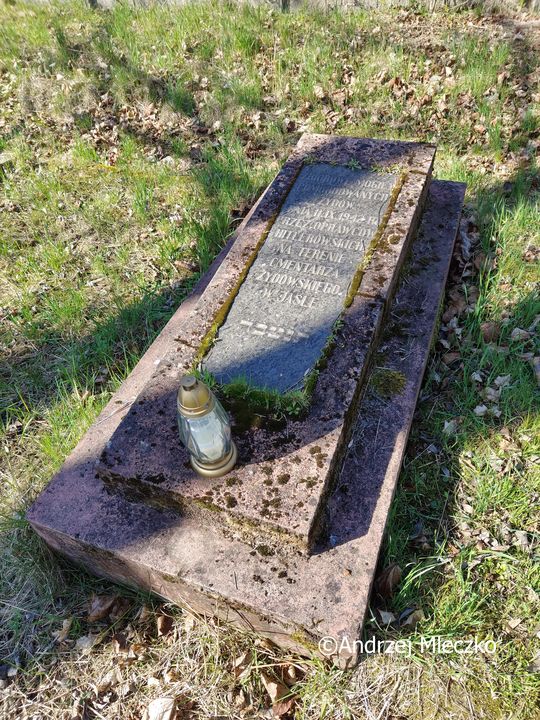 Napis: ZBIOROWE MOGIŁY/ POMORDOWANYCH/ ŻYDÓW/ DNIA 11.IX.1942 R./ PRZEZ OPRAWCÓW HITLEROWSKICH/ NA TERENIE/ CMENTARZA/ ŻYDOWSKIEGO/ W JAŚLE