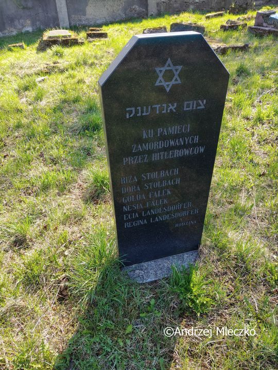 Napis: KU PAMIĘCI/ ZAMORDOWANYCH/ PRZEZ HITLEROWCÓW/ RIZA STOLBACH/ DORA STOLBACH/ GOLDA FALEK/ NESIA FALEK/ ECIA LANDESDORFER/ REGINA LANDESDORFER/ RODZINA