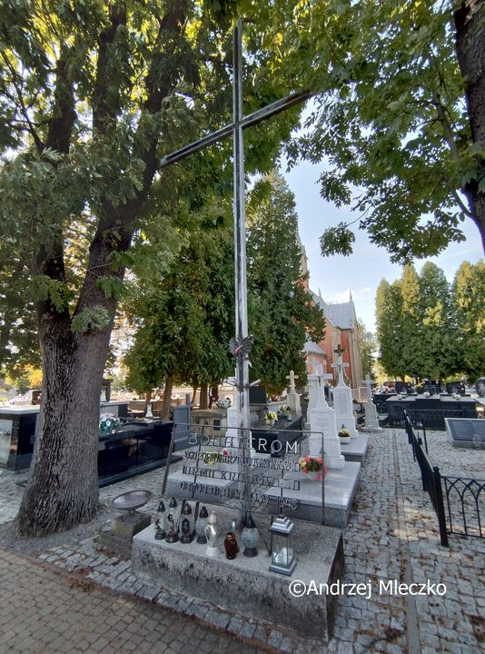 Krzyż znajduje się na terenie cmentarza miejskiego (do 2021 parafialnego) ul. Cmentarna