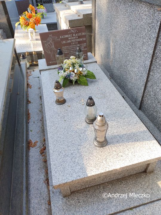 Napis: Ś.P./ KAZIMIERZ GŁASZCZKA/ INCOGNITO/ LUCJAN PIOTROWSKI/ LAT. 22/ ŻOŁNIERZ ARMII KRAJOWEJ CZŁONEK/ OCHOT. STRAŻY POŻARNEJ w DĘBICY/ POLEGŁ W LASKU DĘBICKIM OBOK/ STOMILU w WALCE/ W CZERWCU 1944 r./ CZEŚĆ JEGO PAMIĘCI/ WIECZNY ODPOCZYNEK RACZ MU DAĆ PANIE/ „WSZYSTKO CO NASZE POLSCE ODDAMY”