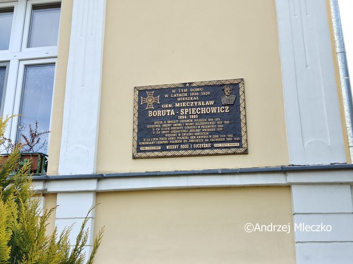 Napis: W TYM DOMU/ W LATACH 1936 – 1939/ MIESZKAŁ/ GEN. MIECZYSŁAW/ BORUTA – SPIECHOWICZ/ 1894 – 1985/ OFICER II BRYGADY LEGIONÓW POLSKICH 1914 – 1918/ UCZESTNIK OBRONY LWOWA I WOJNY BOLSZEWICKIEJ 1918 – 1920/ D-CA 22 DYW. PIECHOTY GÓRSKIEJ W PRZEMYŚLU 1934/ D-CA GRUPY OPERACYJNEJ „BIELSKO” WRZESIEŃ 1939/ WIĘZIONY W ZWIĄZKU SOWIECKIM/ D-CA 5 DYW. PIECH. ARMII POLSKIEJ GEN. ANDERSA W ZSRR 1939 – 1942/ KOMENDANT I KORPUSU POLSKICH SIŁ ZBROJNYCH NA ZACHODZIE 1942 – 1945/ WIERNY BOGU I OJCZYŹNIE/ PROJ. J. RYBCZYŃSKI/ FUND. MIASTO PRZEMYŚL
