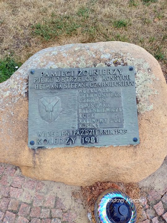 Napis: PAMIĘCI ŻOŁNIERZY/ PUŁKU 3 STRZELCÓW KONNYCH/ im. HETMANA STEFANA CZARNIECKIEGO/ WOŁKOWYSK/ CZERWONY BÓR/ CZERWIN/ HAJNÓWKA/ KALENKIEWICZE/ KOCK/ KALINOWY DÓŁ/ KOSINY/ WRZESIEŃ PAŹDZIERNIK 1939/ KOLEDZY 1981