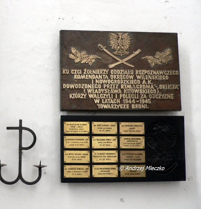 Napis: KU CZCI ŻOŁNIERZY ODDZIAŁU ROZPOZNAWCZEGO/ KOMENDANTA OKRĘGÓW WILEŃSKIEGO/ I NOWOGRODZKIEGO A.K./ DOWODZONEGO PRZEZ RTM."GROMA"-"ORLICZA"/ (WŁADYSŁAWA KITOWSKIEGO)/ KTÓRZY WALCZYLI I POLEGLI ZA OJCZYZNĘ/ W LATACH 1944-1945/ TOWARZYSZE BRONI.