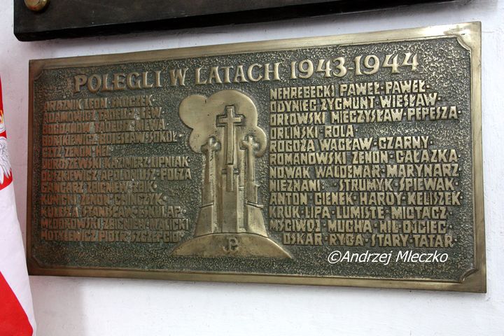 Napis: POLEGLI W LATACH 1943 – 1944/ ARAŻNIK LEON SKOCZEK/ ADAMOWICZ TADEUSZ LEW/ BOGDANÓW TADEUSZ MEWA/ BORTKIEWICZ BOLESŁAW SOKÓŁ/ CZYŻ ZENON HEL/ DOROSZEWSKI KAZIMIERZ LIPNIAK/ DUSZKIEWICZ APOLONIUSZ POLZA/ GANCARZ ZBIGNIEW ŻBIK/ KUNICKI ZENON CHIŃCZYK/ KULESZA STANISŁAW/ ESKULAP/ MŁODKOWSKI ZBIGNIEW MALICKI/ MOTYLEWICZ PIOTR SZCZEPCIO/ NEHREBECKI PAWEŁ PAWEŁ/ ODYNIEC ZYGMUNT WIESŁAW/ ORŁOWSKI MIECZYSŁAW PEPESZA/ ORLIŃSKI ROLA/ ROGOŻA WACŁAW CZARNY/ ROMANOWSKI ZENON GAŁĄZKA/ NOWAK WALDEMAR MARYNARZ/ NIEZNANI: STRUMYK ŚPIEWAK/ ANTON GIENIEK HERDY KELISZEK/ KRUK LIPA LUMISTE MIOTACZ/ MŚCIWOJ MUCHA NIL OJCIEC/ OSKAR RYGA STARY TATAR