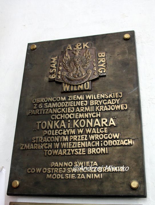 Napis: OBROŃCOM ZIEMI WILEŃSKIEJ/ Z 6 SAMODZIELNEJ BRYGADY/ PARTYZANCKIEJ ARMII KRAJOWEJ/ CICHOCIEMNYCH/ „TOŃKA” i „KONARA”/ POLEGŁYM W WALCE/ STRACONYM PRZEZ WROGÓW/ ZMARŁYCH W WIĘZIENIACH i OBOZACH/ TOWARZYSZE BRONI/ PANNO ŚWIĘTA/ CO W OSTREJ ŚWIECISZ BRAMIE/ MÓDL SIĘ ZA NIMI