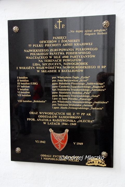 Napis: Ś.P./ „…Nie dajmy zginąć poległym.”/ Zbigniew Herbert/ PAMIĘCI/ OFICERÓW I ŻOŁNIERZY/ 77 PUŁKU PIECHOTY ARMII KRAJOWEJ/ NAJWIĘKSZEGO ZGRUPOWANIA PUŁKOWEGO/ POLSKIEGO PAŃSTWA PODZIEMNEGO/ WALCZĄCEGO W SILE 4500 PARTYZANTÓW/ NA TERENACH POWIATÓW/ LIDA, SZCZUCZYN, NOWOGRÓDEK/ I WOŁOŻYN WOJEWÓDZTWA NOWOGRÓDZKIEGO II RP/ W SKŁADZIE 8 BATALIONÓW/ I batalion por. Władysław Żogło „Zycha”/ II batalion por. Jana Borysewicza „Krysi”/ III batalion (UBK) ppor. Bolesław Piaseckiego „Sablewskiego”/ IV batalion ppor. Czesława Zajączkowskiego „Ragnera”/ V batalion kpt. Stanisława Truszkowskiego „Sztremera”/ VI batalion ppor. Stanisława Dedelisa „Pala”/ VII batalion ppor. BojTworzyańskiego „Ostoi”/ i por. cc. Jana Piwnika "Ponurego”/ VIII batalionu „Bohdanka” por. Władysława Mossakowskiego „Jastrzębca”/ por. Tadeusza Drobniaka „Jarosza”/ i ppor. Józefa Zwinogrodzkiego „Turkucia”/ ORAZ WYWODZĄCYCH SIĘ Z 77 PP AK/ ODDZIAŁÓW SAMOOBRONY/ PPOR. ANATOLA RADZIWONIKA „OLECHA”/ W LATACH 1944 – 1949/ VI 1942 V 1949/ ODDALI ŻYCIE ZA CAŁOŚĆ/ I NIEPODLEGŁOŚĆ POLSKI