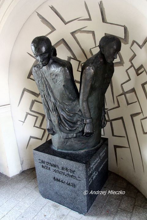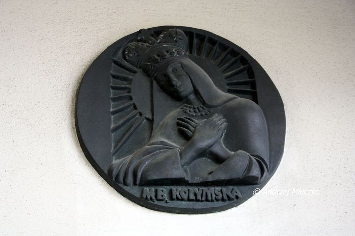 We wnękach znajdują się tablice inskrypcyjne oraz pomnik przedstawiający trzy spętane postacie. Nad tablicą medalion z MB Kołymską.
