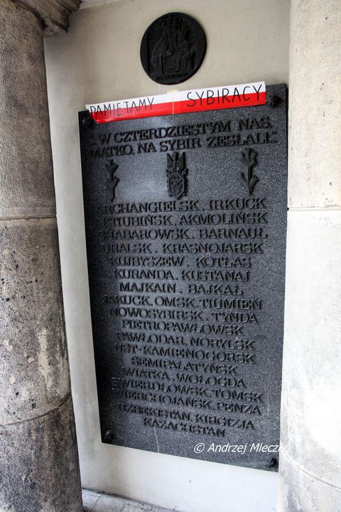 Napis: "...W CZTERDZIESTYM NAS./ MATKO. NA SYBIR ZESŁALI..."/ ARCHANGIELSKI, IRKUCK/ AKTIUBIŃSK, AKMOLIŃSK/ CHABAROWSK, BARNAUŁ/ URALSK, KRASNOJARSK/ KUJBYSZEW/ KOTŁAS/ KURANDA, KUSTANAJ/ MAJKAIN, BAJKAŁ/ JAKUCK, OMSK, TIUMEŃ/ NOWOSYBIRSK, TYNDA/ PIETROPAWŁOWSK,/ PAWŁODAR, NORYLSK/ UST-KAMIENOGORSK/ SEMIPAŁATYŃSK/ WIATKA, WOŁOGDA/ SWIERDŁOWSK, TOMSK/ WIERCHOJAŃSK, PENZA/ UZBEKISTAN, KIRGIZJA/ KAZACHSTAN