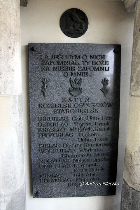 Napis: A JEŚLIBYM O NICH/ ZAPOMNIAŁ, TY BOŻE/ NA NIEBIE ZAPOMNIJ/ O MNIE..."/ KATYŃ/ KOZIELSK, OSTASZKÓW/ STAROBIELSK/ IRKUTŁAG Czita, Ułan-Ude/ OZIERŁAG Tajszei, Brack/ KRASŁAG Marjińsk, Kańsk/ PECZORŁAG Peczora,/ Uchia, Iżma/ SIBŁAG Ołżeras, Kemierowo/ WORKUTŁAG Workuta,/ Chałmer-Ju, Mulda/ NORYLŁAG Norylsk, Igarka/ ONIEGŁAG Kargopol,/ Nowa Ziemia/ MINŁAG Inta, Abież/ KOŁYMŁAG Magadan,/ Kołyma, Ortokan