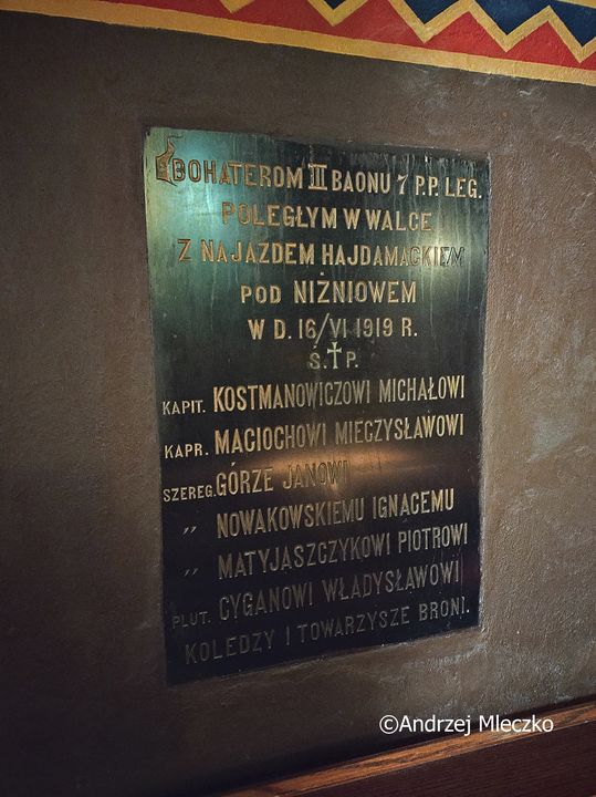Napis: BOHATEROM III BAONU 7 P.P. LEG./ POLEGŁYM W WALCE/ Z NAJAZDEM HAJDAMACKIEM/ POD NIŻNIOWEM/ W D.16/VI 1919 R./ Ś.P./ KAPIT. KOSTMANOWICZOWI MICHAŁOWI/ KAPR. MACIOCHOWI MIESZYSŁAWOWI/ SZEREG. GÓRZE JANOWI/ NOWAKOWSKIEMU IGNACEMU/ MATYJASZCZYKOWI PIOTROWI/ PLUT. CYGANOWI WŁADYSŁAWOWI/ KOLEDZY I TOWARZYSZE BRONI.