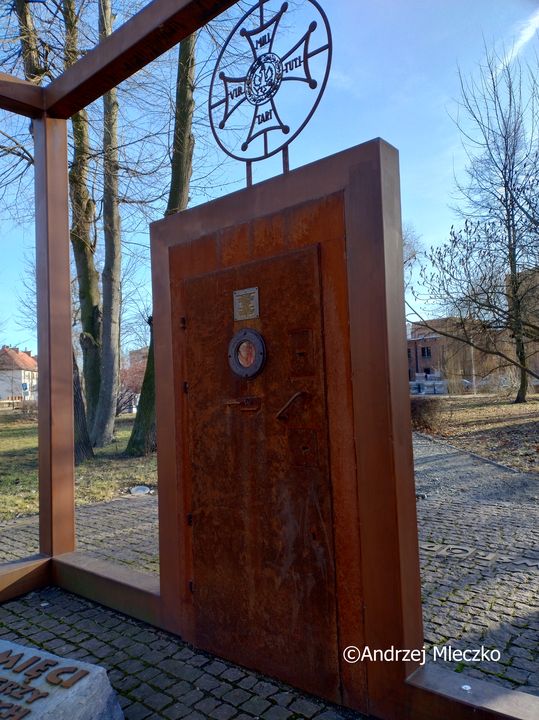 Nad drzwiami stylizowanymi na drzwi więzienia umieszczono krzyż Virtuti Militari. Przed nimi znajduje się kamienny blok, a całość umieszczona jest w sześcianie, przed którym zatoczone jest koło z krzyżem, symbolizujące grób Chrystusa.