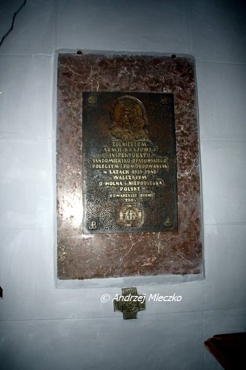 Napis: ŻOŁNIERZOM/ ARMII KRAJOWEJ/ INSPEKTORATU/ SANDOMIERSKO-OPATOWSKIEGO/ POLEGŁYM I POMORDOWANYM/ W LATACH 1939-1945/ WALCZĄCYM/ O WOLNĄ I NIEPODLEGŁĄ/ POLSKĘ/ TOWARZYSZE BRONI/ 1984