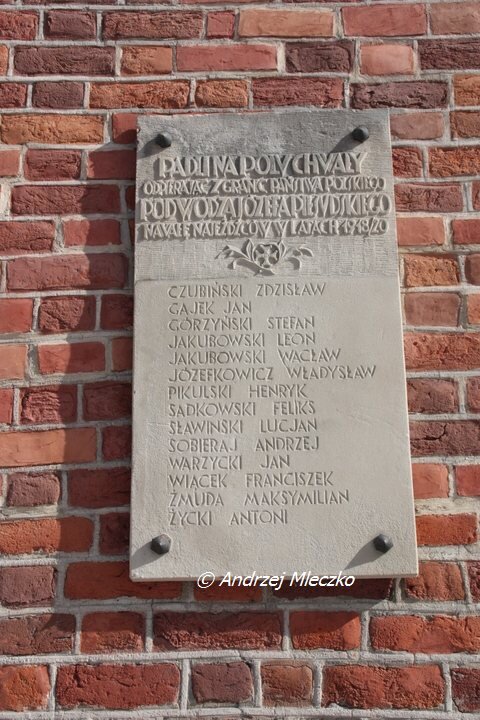 Napis: PADLI NA POLU CHWAŁY/ ODPIERAJĄC Z GRANIC PAŃSTWA POLSKIEGO/ POD WODZĄ JÓZEFA PIŁSUDSKIEGO/ NAWAŁĘ NAJEŹDŹCÓW W LATACH 1918/20/ CZUBIŃSKI ZDZISŁAW/ GAJEK JAN/ GÓRZYŃSKI STEFAN/ JAKUBOWSKI LEON/ JAKUBOWSKI WACŁAW/ JÓZEFKOWICZ WŁADYSŁAW/ PIKULSKI HENRYK/ SADKOWSKI FELIKS/ SŁAWIŃSKI LUCJAN/ SOBIERAJ ANDRZEJ/ WARZYCKI JAN/ WIĄCEK FRANCISZEK/ ŻMUDA MAKSYMILIAN/ ŻYCKI ANTONI