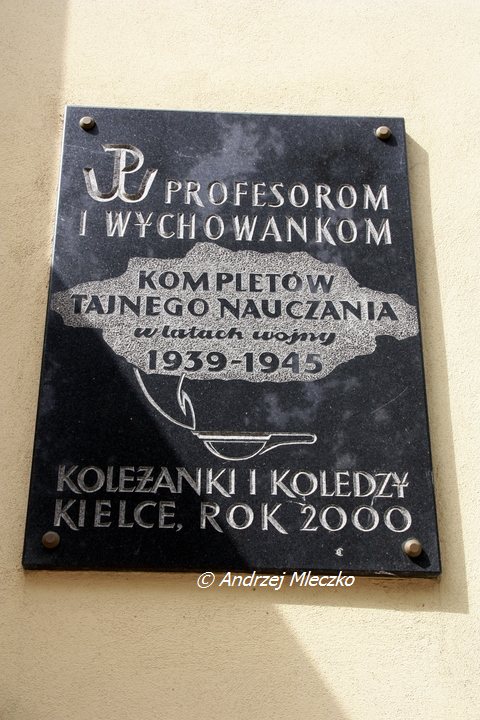 Napis: PROFESOROM/ I WYCHOWANKOM/ KOMPLETÓW/ TAJNEGO NAUCZANIA/ w latach wojny/ 1939-1945/ KOLEŻANKI I KOLEDZY/ KIELCE, ROK 2000