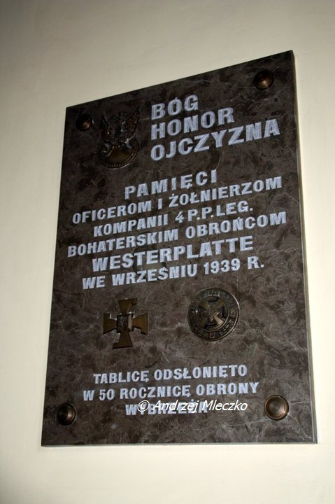Napis: BÓG HONOR OJCZYZNA/ PAMIĘCI/ OFICEROM I ŻOŁNIERZOM/ KOMPANII 4 P.P. LEG./ BOHATERSKIM OBROŃCOM/ WESTERPLATTE/ WE WRZEŚNIU 1939 R./ TABLICĘ ODSŁONIĘTO/ W 50 ROCZNICĘ OBRONY/ WYBRZEŻA
