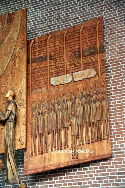 Ołtarz składa się z 4 płaszczyzn. Na dwóch środkowych razem połączonych, przedstawiona jest scena, w której Matka Boża ofiarowuje Maksymilianowi Kolbe do wyboru dwie korony - czerwoną oznaczającą męczeństwo oraz białą czyli czystość. Maksymilian Kolbe przyjmuje oba dary. Na lewej płaszczyźnie przedstawiona jest działalność świętego w Japonii, na prawej moment ofiarowania swego życia za Franciszka Gajowniczka. W mensie ołtarzowej umieszczono numery obozowe, np 61908 czyli bł. ks. Romana Sitko.