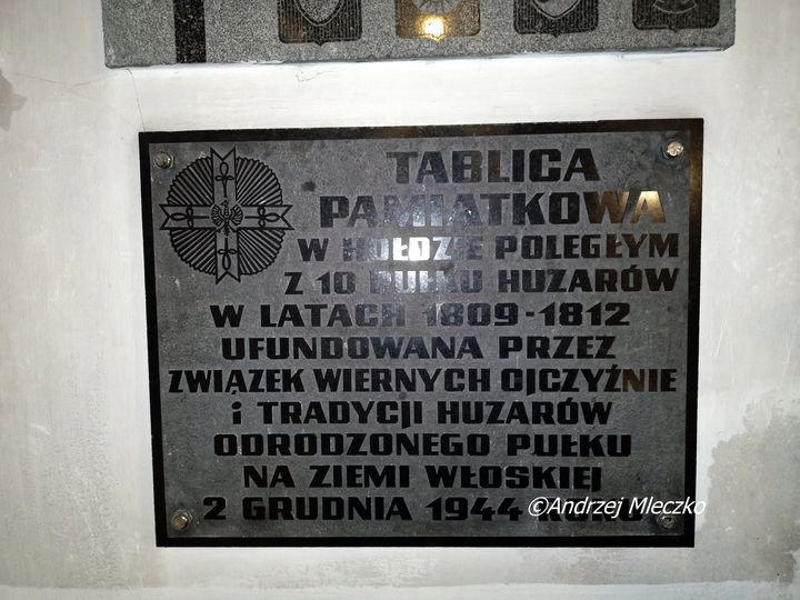 Napis: TABLICA PAMIĄTKOWA/ W HOŁDZIE POLEGŁYM/ Z 10 PUŁKU HUZARÓW/ W LATACH 1809-1812/ UFUNDOWANA PRZEZ/ ZWIĄZEK WIERNYCH OJCZYŹNIE/ i TRADYCJI HUZARÓW/ ODRODZONEGO PUŁKU/ NA ZIEMI WŁOSKIEJ/ 2 GRUDNIA 1944 ROKU