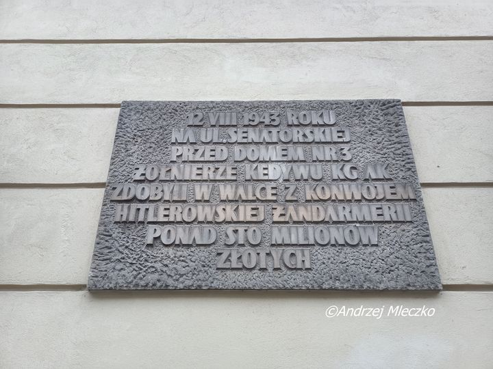 Napis: 12 VIII 1943 ROKU/ NA UL. SENATORSKIEJ/ PRZED DOMEM NR 3/ ŻOŁNIERZE KEDYWU KG AK/ ZDOBYLI W WALCE Z KONWOJEM/ HITLEROWSKIEJ ŻANDARMERII/ PONAD STO MILIONÓW/ ZŁOTYCH