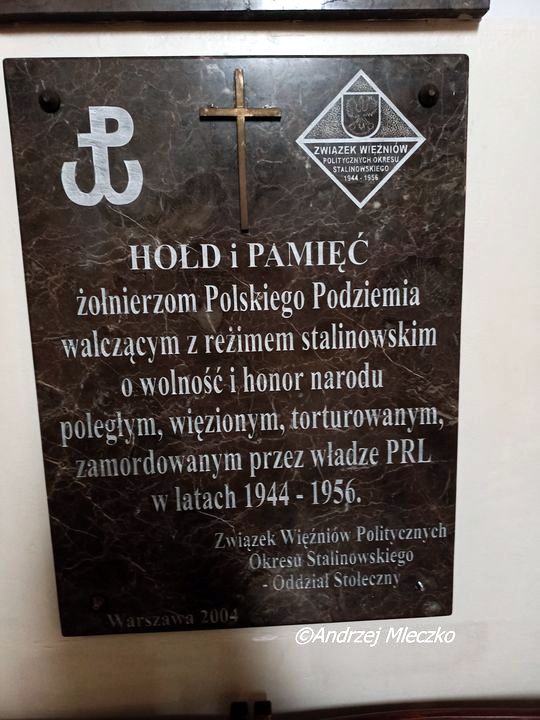 Napis: HOŁD i PAMIĘĆ/ żołnierzom Polskiego Podziemia/ walczącym z reżimem stalinowskim/ o wolność i honor narodu/ poległym, więzionym i torturowanym,/ zamordowanym przez władze PRL/ w latach 1944 – 1956./ Związek Więźniów Politycznych/ Okresu Stalinowskiego/ Oddział Stołeczny/ Warszawa 2004