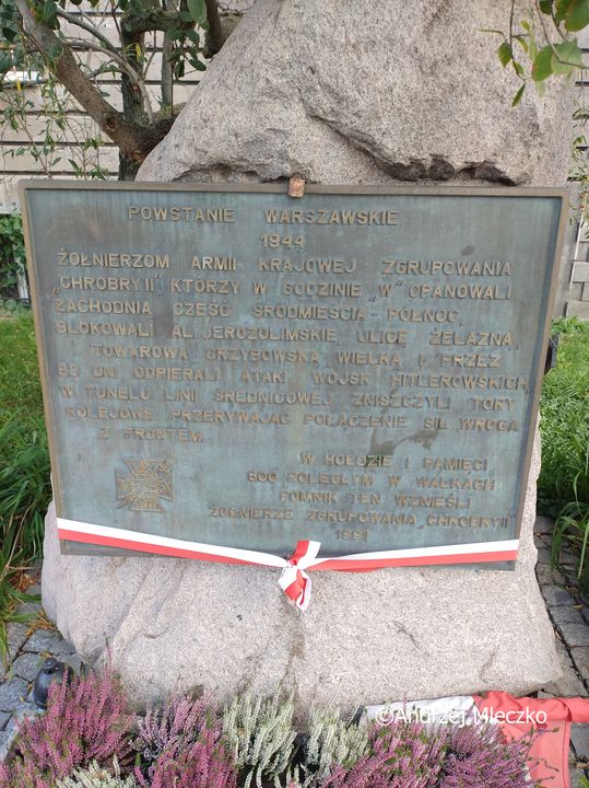 Napis: POWSTANIE WARSZAWSKIE/ 1944/ ŻOŁNIERZOM ARMII KRAJOWEJ ZGRUPOWANIA/ „CHROBRY II” KTÓRZY W GODZINIE „W” OPANOWALI/ ZACHODNIĄ CZĘŚĆ ŚRÓDMIEŚCIA – PÓŁNOC/, BLOKOWALI AL. JEROZOLIMSKIE, ULICĘ ŻELAZNĄ,/ TOWAROWĄ, GRZYBOWSKĄ, WIELKĄ I PRZEZ/ 63 DNI ODPIERALI ATAKI WOJSK HITLEROWSKICH, W TUNELU LINII ŚREDNICOWEJ ZNISZCZYLI TORY/ KOLEJOWE PRZERYWAJĄC POŁĄCZENIE SIŁ WROGA/ Z FRONTEM. W HOŁDZIE I PAMIĘCI/ 600 POLEGŁYM W WALKACH/ POMNIK TEN WZNIEŚLI/ ŻOŁNIERZE ZGRUPOWANIA „CHROBRY II”/ 1991