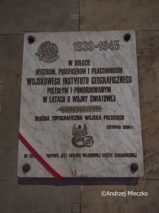 Napis: 1939-1945/ W HOŁDZIE/ OFICEROM, PODOFICEROM I PRACOWNIKOM/ WOJSKOWEGO INSTYTUTU GEOGRAFICZNEGO/ POLEGŁYM I POMORDOWANYM/ W LATACH II WOJNY ŚWIATOWEJ/ SŁUŻBA TOPOGRAFICZNA WOJSKA POLSKIEGO/ LISTOPAD 2000 r./ OD 1933 BUDYNEK JEST SIEDZIBĄ WOJSKOWEJ SŁUŻBY GEOGRAFICZNEJ