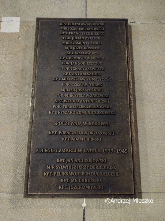 Napis: KPT. BOLESŁAW MENTRAK/ MJR JÓZEF MICHAŁOWSKI/ KPT. FRANCISZEK NIEDEK/ POR. JULIAN OSTABSKI/ MJR ZYGMUNT PALUCH/ MJR JÓZEF RÖSSLER/ KPT. WACŁAW RYŚ/ KPT. BRONISŁAW SIKORA/ POR. JAN SOBIESZCZUK/ PPOR. IGNACY SZEWCZYK/ KPT. ANTONI SZTORC/ KPT. MIECZYSŁAW TOMASZCZYK/ POR. CZESŁAW TUREK/ MJR LUCJUSZ WOŹNIAK/ POR. MIECZYSŁAW ZARZYCKI/ KPT. WITOLD ANTONI ŻARSKI/ POR. FRANCISZEK ŻELAZOWSKI/ KPT. RYSZARD EDMUND ŻUKOWSKI/ SPOCZYWAJĄ W BUKOWNI/ KPT. WIEŃCZYSŁAW BRZOZOWSKI/ KPT. ADAM LIPIŃSKI/ POLEGLI I ZMARLI W LATACH 1939-1945/ KPT. JAN ANDRZEJOWSKI/ MJR SYLWIUSZ JERZY BERBERIUSZ/ KPT. FELIKS WOJCIECH BUCHALCZYK/ KPT. JAN CHRUŚCIEL/ KPT. JÓZEF DMOWSKI