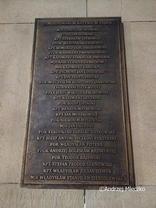 Napis: ZAMORDOWANI W KATYNIU W 1940 R./ MJR STANISŁAW ADAMSKI/ PPOR. JAN BEDNARZ/ KPT. STANISŁAW CZEREMSKI/ PPOR. WŁADYSŁAW DESZCZKA/ KPT. ROMUALD OLEG DROZDOWSKI/ PPOR. KAZIMIERZ DWORAKOWSKI/ KPT. KAZIMIERZ STANISŁAW DWORNIAK/ MJR NARCYZ PIOTR DYMITRÓW/ MJR KAZIMIERZ GARSTKA/ KPT. ZYGMUNT JAN GOSIEWSKI/ KPT. JAN TEOFIL JANICKI/ POR. MIECZYSŁAW KONSTANTY JANKOWSKI/ CHOR. FRANCISZEK KOZIEJ/ PPŁK JERZY WIKTOR LEWAKOWSKI/ KPT. KAZIMIERZ LEYTNER/ POR. JÓZEF LIPIŃSKI/ KPT. HENRYK MATKOWSKI/ KPT. JAN MOSZKOWICZ/ POR. HIERONIM MYŚLIWSKI/ MJR JAN OKUPSKI/ POR. FERDYNAND OSPALEC-OSTROWSKI/ KPT. JÓZEF ANTONI SZCZĘSNY PERZYŃSKI/ POR. WŁADYSŁAW POTERA/ PPOR. ANDRZEJ BOLESŁAW RADWAŃSKI/ POR. TEODOR RAJEWSKI/ KPT. STEFAN TEODOR SARNOWSKI/ KPT. WŁADYSŁAW JULIAN SIEMEK/ MJR WŁADYSŁAW STANISŁAW SIEROSŁAWSKI
