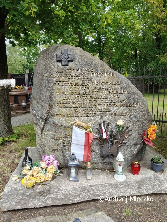 Napis: NIE CHCIELI ŻYĆ/ W KOMUNISTYCZNYM UPODLENIU/ GINĘLI W WALCE/ I SKRYTOBÓJCZO MORDOWANI/ W LATACH 1939 – 1989/ W HOŁDZIE PATRIOTOM POLSKIM/ BESTIALSKO ZAMĘCZONYM/ PRZEZ SOWIECKICH OKUPANTÓW/ I ICH SŁUŻALCZYCH KOMUNISTÓW POLSKICH/ KU PRZESTRODZE/ PRZYSZŁYM POKOLENIOM POLAKÓW/ ZWIĄZEK WIĘŹNIÓW POLITYCZNYCH/ SKAZANYCH/ NA KARĘ ŚMIERCI/ W OKRESIE/ REŻIMU KOMUNISTYCZNEGO/ WARSZAWA WRZESIEŃ 1999 R.