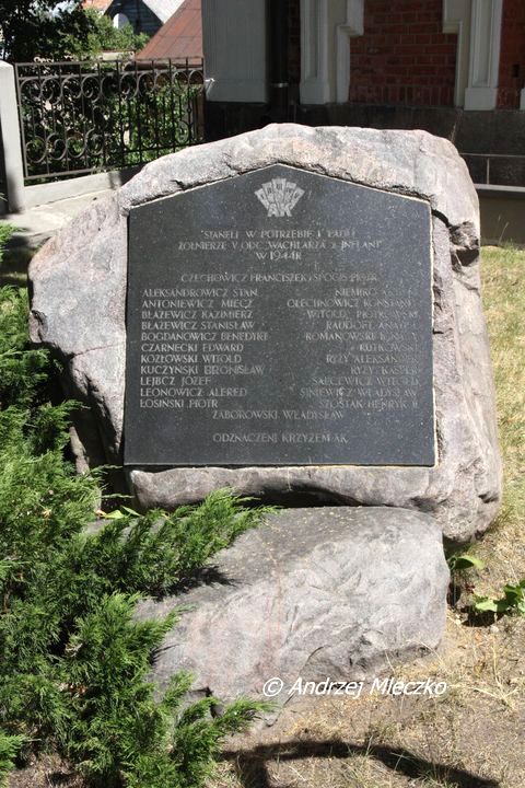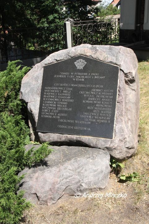Napis: STANĘLI W POTRZEBIE I PADLI/ ŻOŁNIERZE V ODC. "WACHLARZA" Z INFLANT/ W 1944R./ CZECHOWICZ FRANCISZEK I SPOGIS PIOTR/ ALEKSANDROWICZ STAN./ ANTONIEWICZ MIECZ./ BŁAŻEWICZ KAZIMIERZ/ BŁAŻEWICZ STANISŁAW/ BOGDANOWICZ BENEDYKT/ CZARNECKI EDWARD/ KOZŁOWSKI WITOLD/ KUCZYŃSKI BRONISŁAW/ LEJBCZ JÓZEF/ LEONOWICZ ALFRED/ ŁOSIŃSKI PIOTR/ NIEMIRO ANTONI/ OLECHNOWICZ KONSTANTY/ WITOLD PIOTROWSKI/ RAUDOFT ANATOL/ ROMANOWSKI IGNACY/ RUTKOWSKI/ RYŻY ALEKSANDER/ RYŻY KASPER/ SALCEWICZ WITOLD/ SINIEWICZ WŁADYSŁAW/ SZOSTAK HENRYK II/ ZABOROWSKI WŁADYSŁAW/ ODZNACZENI KRZYŻEM AK
