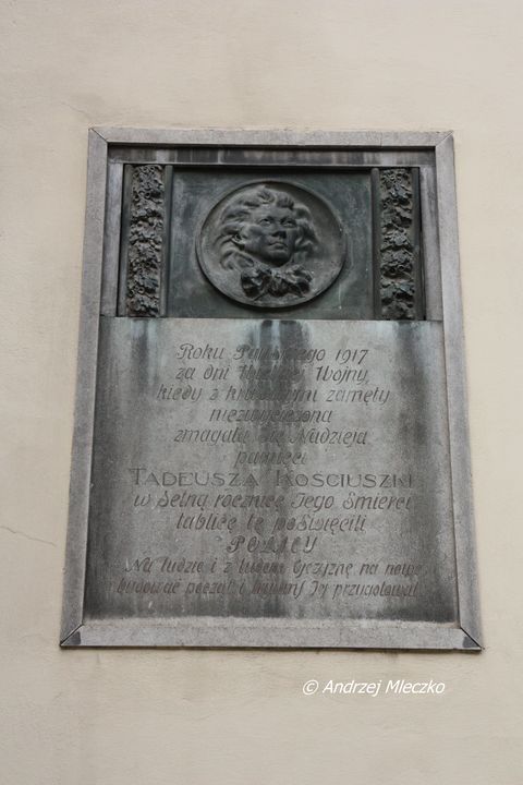 Napis: Roku Pańskiego 1917/ za dni Wielkiej Wojny/ kiedy z krwawymi zamęty/ niezwyciężona/ zmagała się Nadzieja/ pamięci/ TADEUSZA KOŚCIUSZKI/ w setną rocznicę Jego Śmierci/ tablicę tę poświęcili/ POLACY/ Na ludzie i z ludem Ojczyznę na nowo/ budować począł i tryumf Jej przygotował