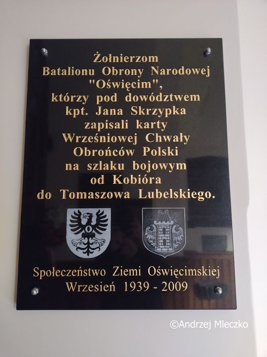 Napis: Żołnierzom/ Batalionu Obrony Narodowej/ „Oświęcim”,/ którzy pod dowództwem/ kpt. Jana Skrzypka/ zapisali karty/ Wrześniowej Chwały/ Obrońców Polski/ na szlaku bojowym/ od Kobióra/ do Tomaszowa Lubelskiego./ Społeczeństwo Ziemi Oświęcimskiej/ Wrzesień 1939 – 2009